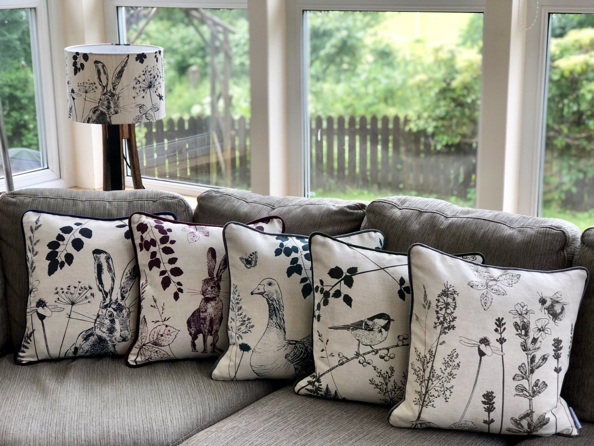 We are a small company based in rural Aberdeenshire in Scotland, creating luxury soft furnishings and beautiful products for your home. Our illustrated designs are inspired by the British countryside and wildlife, and are printed onto luxury natural linen to create lampshades, cushions and footstools, and screenprinted onto British bone china for our wonderfully scented soy wax candles.
