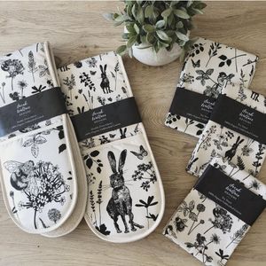 Choose from two styles of double oven glove and three styles of tea towel, printed onto organic unbleached cotton panama